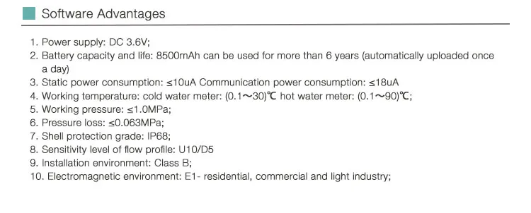 and low cost. t is also called the "Narrowband Internet of Things".Because of its very low communication power consumption, the NB-loT wireless remote water meter can continue to work for more than six years without changing the battery. Using the NB-loT wireless remote water meter can realize the wireless automatic meter reading function. At the same time every day, the NB-loT module will collect and automatically transmit the water consumption data of each household to the management platform.Perform statistical analysis and charge for the water consumption of water meters in the managementarea.